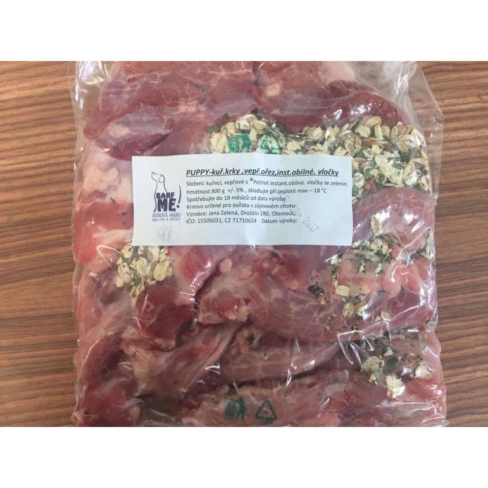 500 g kuřecí krky, 250 g vepřový ořez a 50 g instatní obilné vločky se zeleninou ( po zalití vodou = 250 g přílohy)